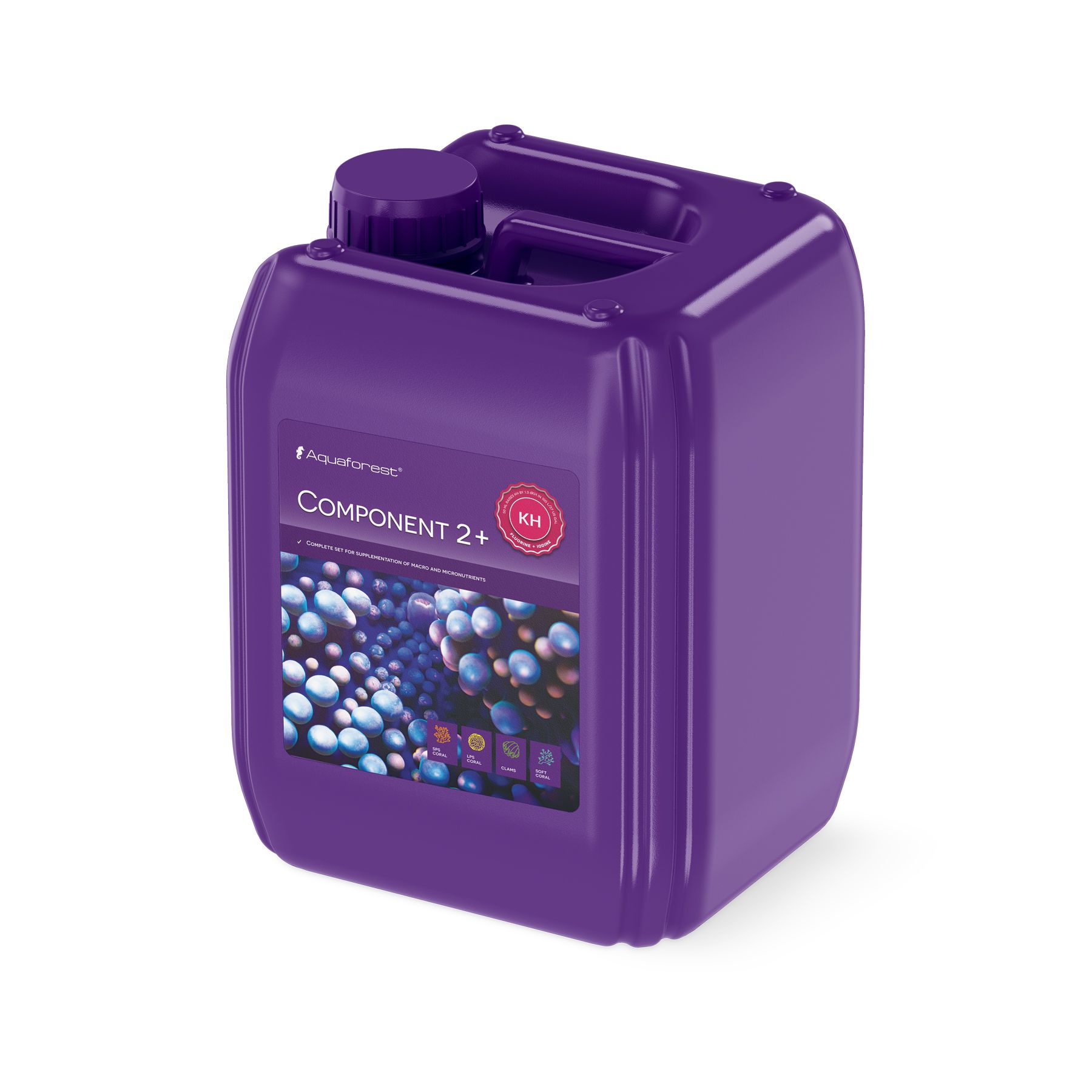 Component 2+ obsahuje: NaHCO3, F, I. (25 ml rozpuštěných ve 100 l zvyšuje KH o 0,65 dKH (Alk: 0,23 meq/l)).
