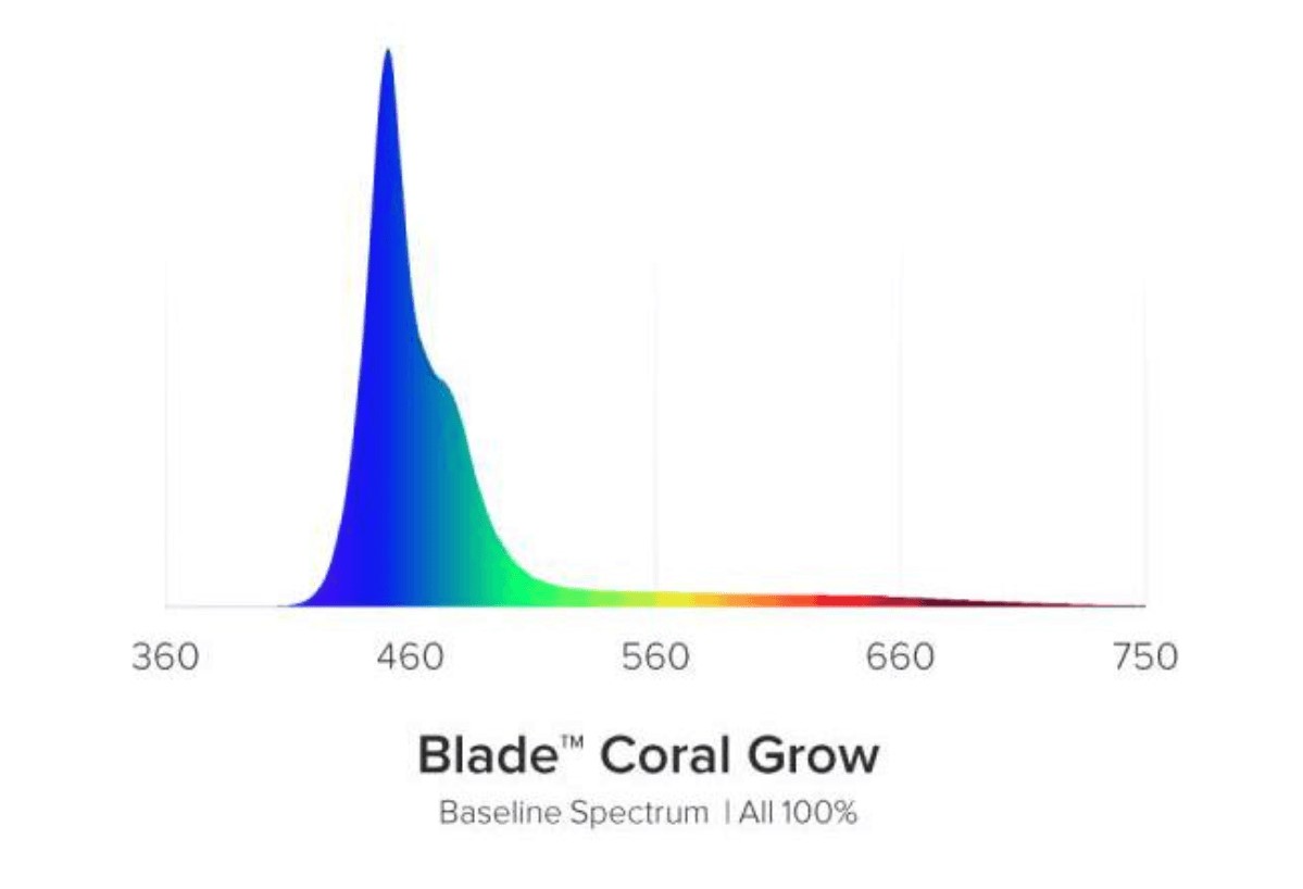 - Rovnováha modrých a bílých diod účinně řeší fotosyntetické potřeby korálů. Blade Grow poskytuje výstup v tmavě modré až modré oblasti spektra (400-500 nm), což je prokazatelně vysoce účinný rozsah spektra v moři.