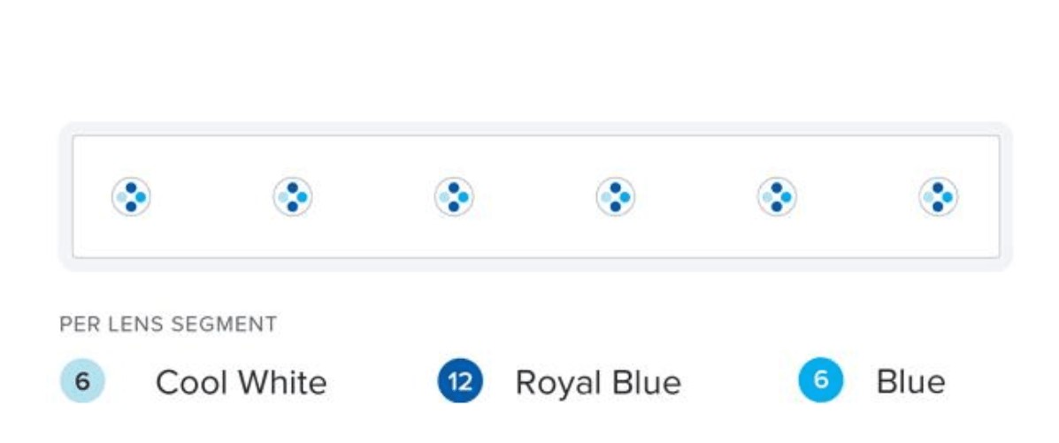 AI Blade Grow využívá skupinovou konfiguraci. Každá velikost Bladu zahrnuje zhruba jednu skupinu LED na 30,5cm. Pevné seskupení a vyvážené umístění diod přispívá k neuvěřitelné rovnováze a třpytu, které platforma Blade poskytuje. Blade Coral Grow obsahuje následujících 24 diod na skupinu LED.