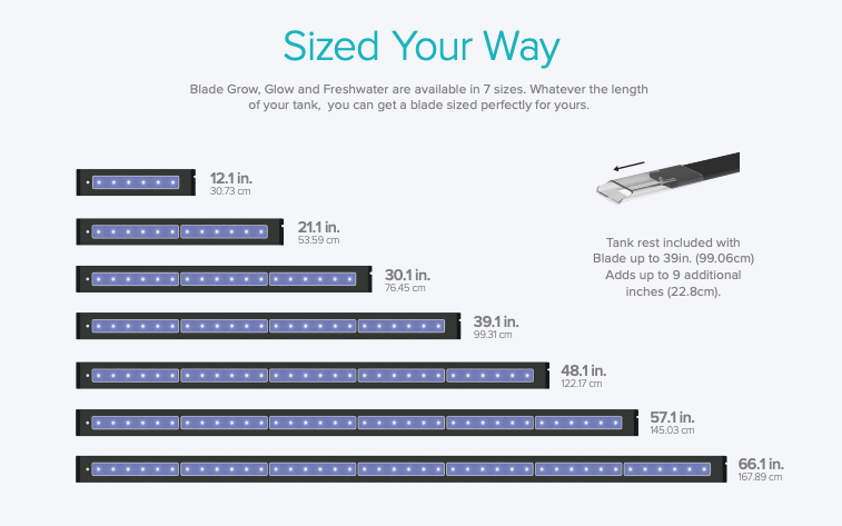 Blade Coral Grow, Blade Coral Glow a Blade Freshwater jsou dostupné v 7 různých velikostech . Bez ohledu na velikost nádrže nebo použití, Blade bude mít vždy co nabídnout.