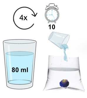 Postupné přidávání vody: Pomalu přidávejte do sáčku vodu z vašeho akvária (cca 50-80ml) a opakujte tento krok čtyřikrát s desetiminutovými pauzami mezi nimi.
