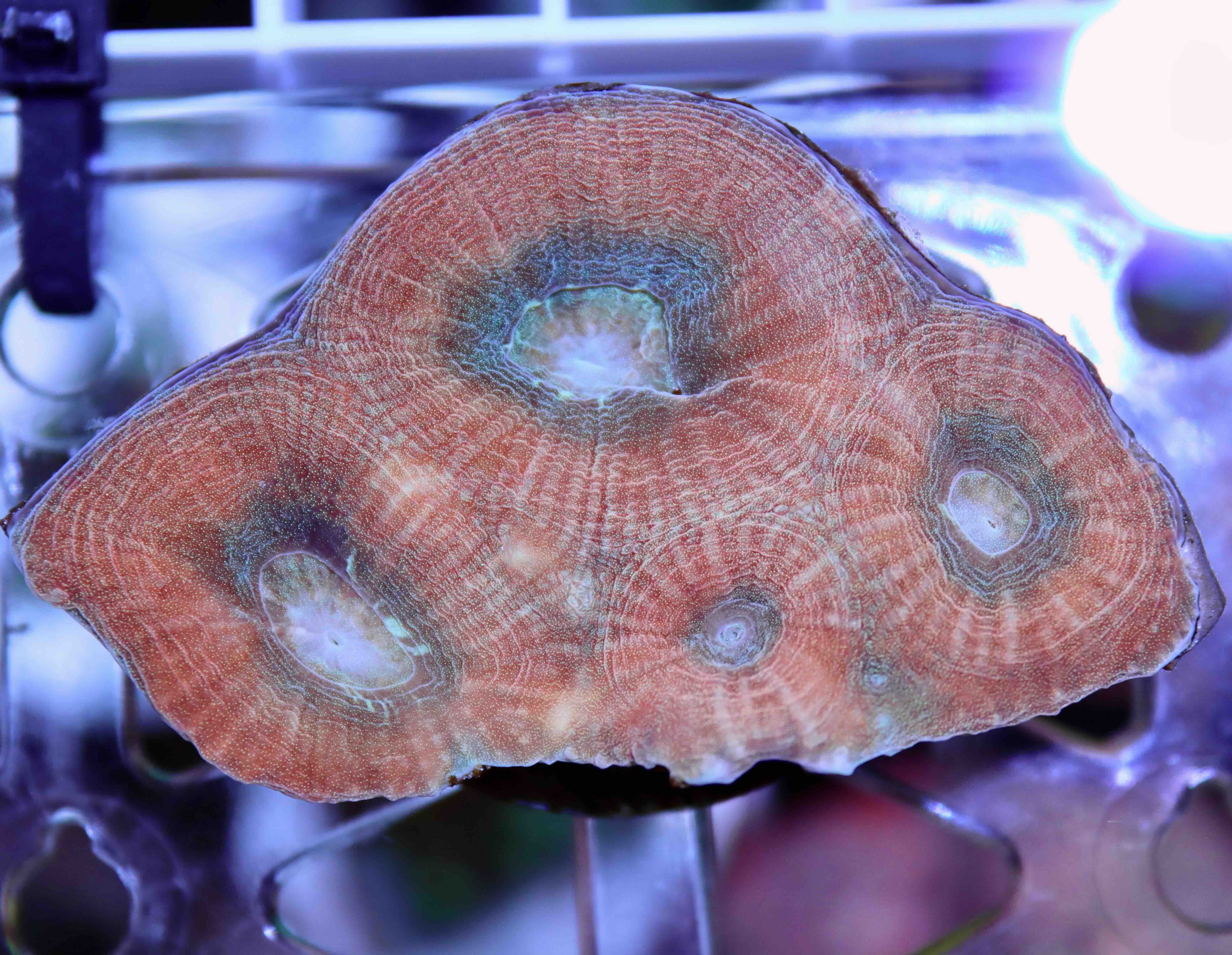 - Fotografie korálu zahrnuje snímek pořízený pod modrým světlem s oranžovým filtrem, který zvýrazňuje fluorescenční barvy. Toto zbarvení korál obvykle vykazuje ve večerních hodinách při použití kvalitních stmívatelných LED zdrojů. Barva korálu při běžném denním akvarijním osvětlení se může výrazně lišit. Pro lepší představu si prohlédněte také snímek pod normálním osvětlením.