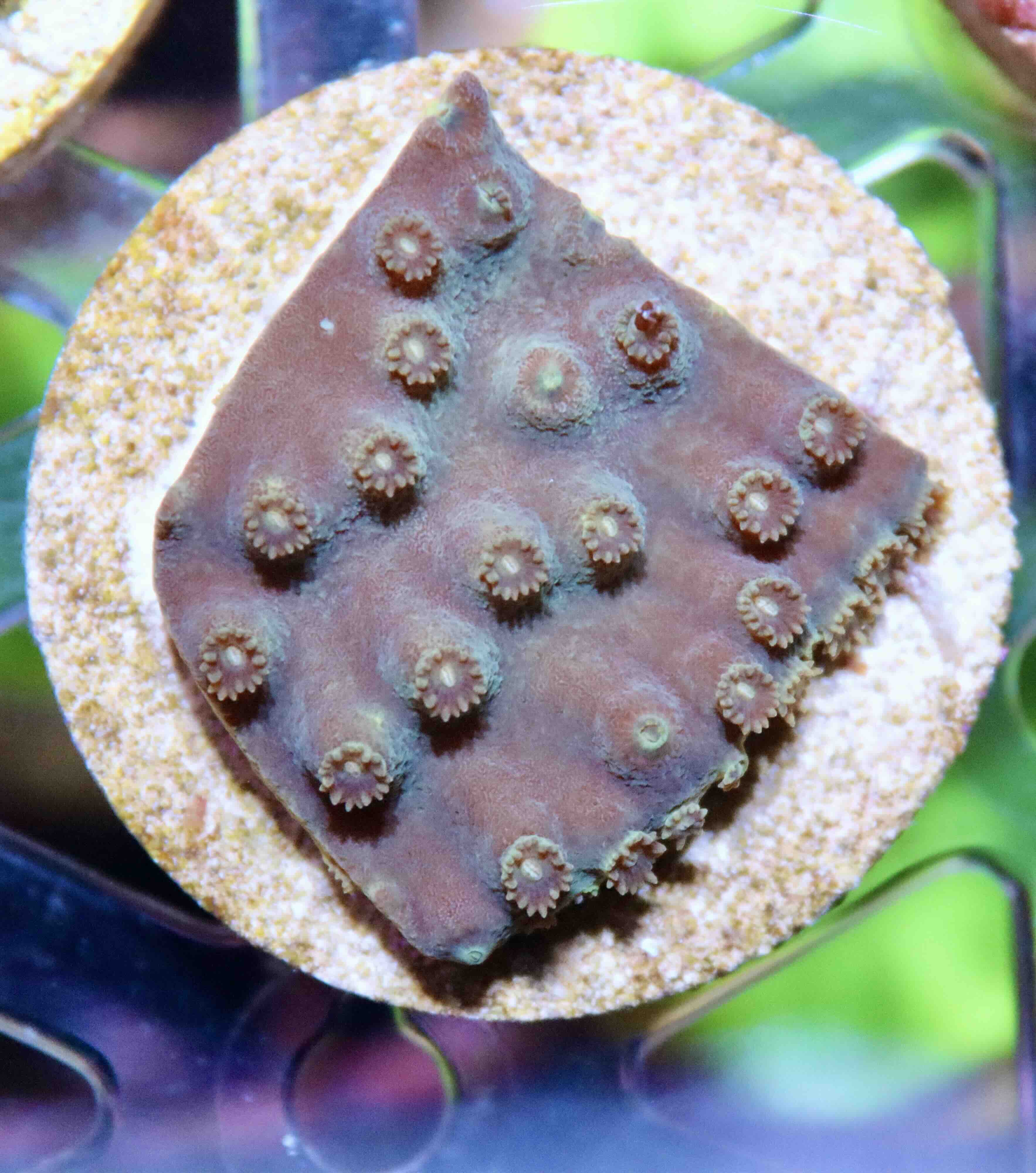 - Fotografie korálu zahrnuje snímek pořízený pod modrým světlem s oranžovým filtrem, který zvýrazňuje fluorescenční barvy. Toto zbarvení korál obvykle vykazuje ve večerních hodinách při použití kvalitních stmívatelných LED zdrojů. Barva korálu při běžném denním akvarijním osvětlení se může výrazně lišit. Jedná se o stejný druh korálu, avšak nemusí jít o zcela totožný kus, který vám bude doručen. Pro lepší představu si prohlédněte také snímek pod normálním osvětlením.