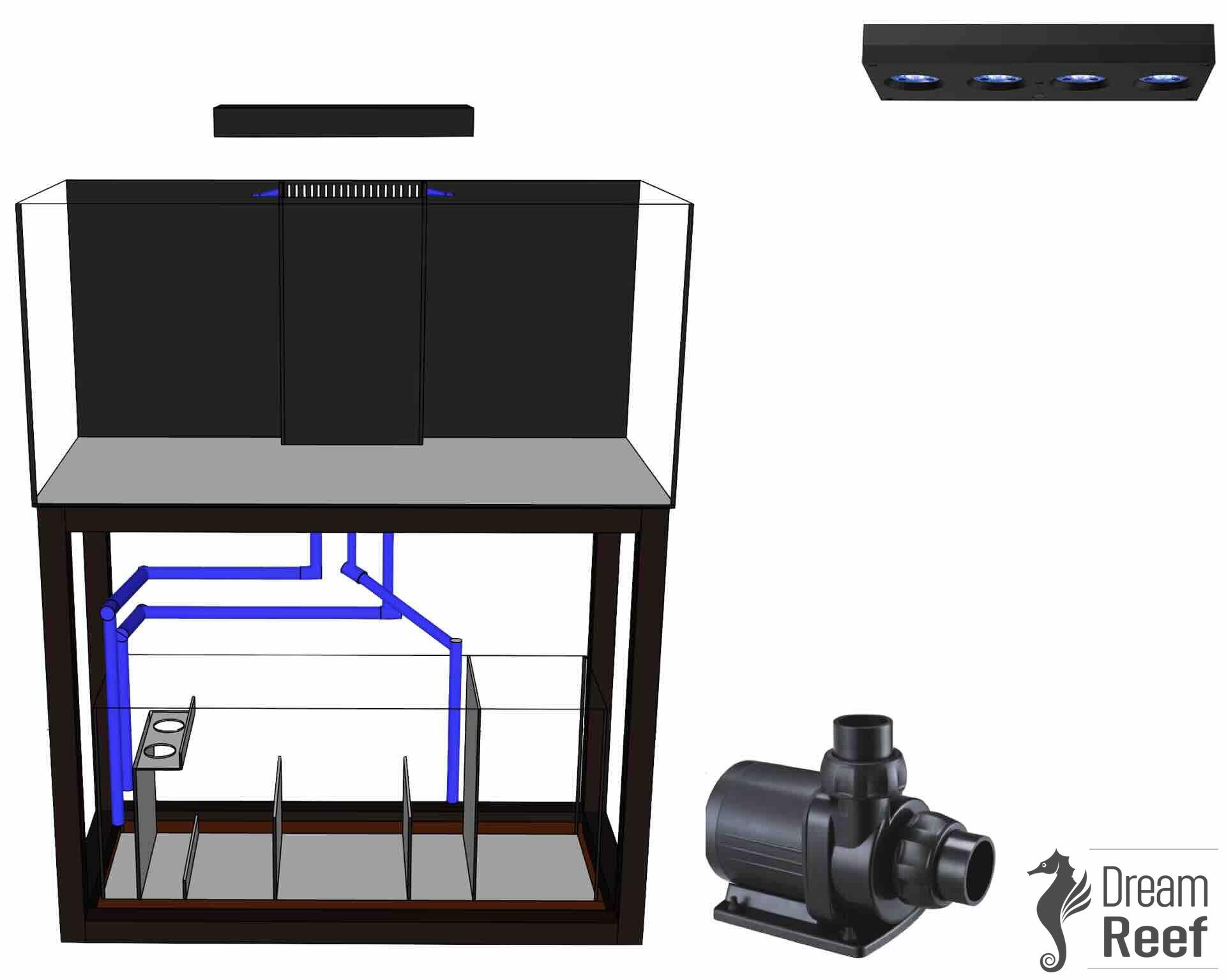 Skleněné akvárium s elegantním podstavcem, vybavené kompletním systémem cirkulace vody, včetně profesionální filtrace ("sumpu"). Přepadový kanál zajišťuje ultra tichý koloběh vody, a možnost integrovaného doplňování odpařené vody (ATO) dodává flexibilitu a pohodlí.