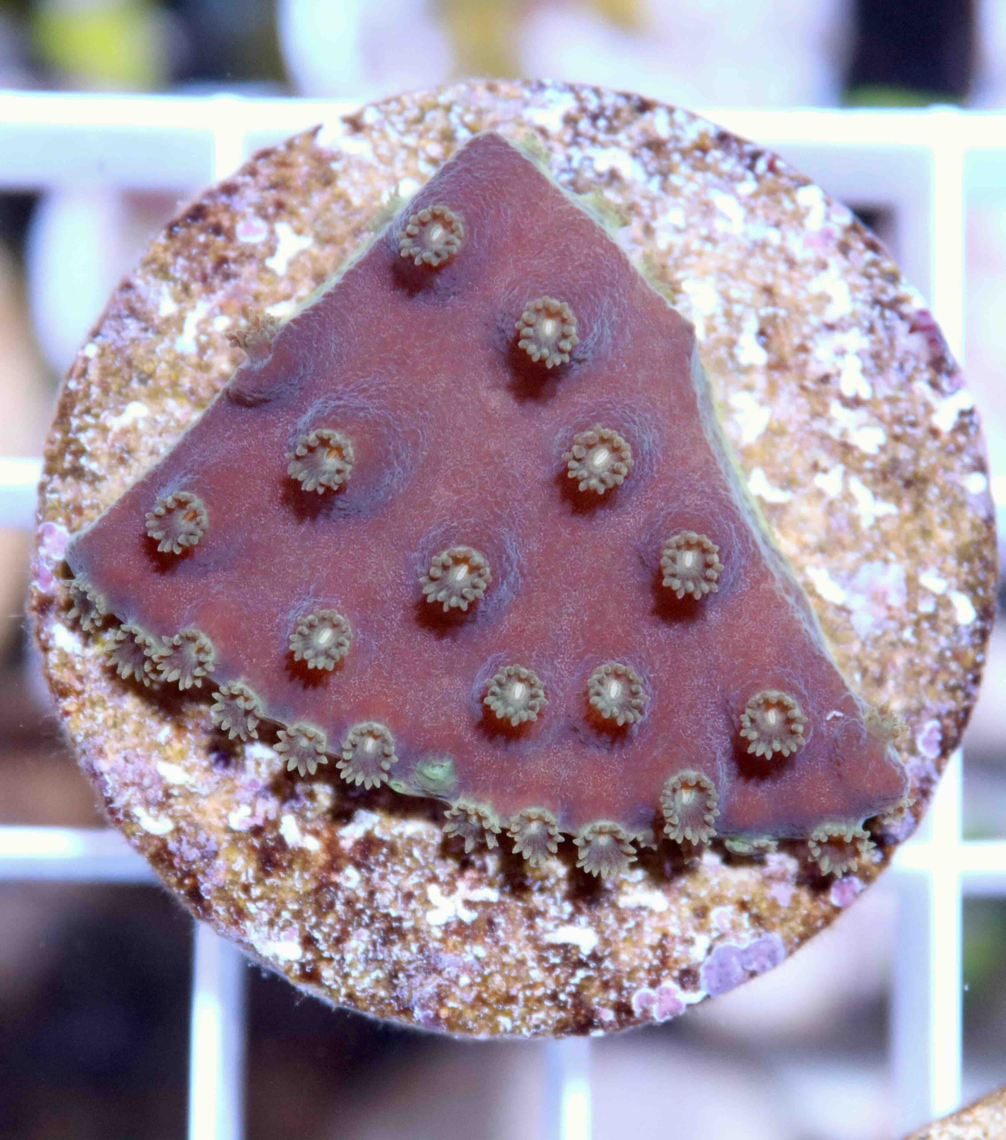 - Fotografie korálu zahrnuje snímek pořízený pod modrým světlem s oranžovým filtrem, který zvýrazňuje fluorescenční barvy. Toto zbarvení korál obvykle vykazuje ve večerních hodinách při použití kvalitních stmívatelných LED zdrojů. Barva korálu při běžném denním akvarijním osvětlení se může výrazně lišit. Jedná se o stejný druh korálu, avšak nemusí jít o zcela totožný kus, který vám bude doručen. Pro lepší představu si prohlédněte také snímek pod normálním osvětlením.